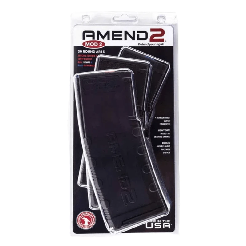 Amend2 Red, White, and Blue Special Edition 5.56mm NATO/223 Remington 3 Pack Magazine – 30 Rounds – The Amend2 30 round magazine is a sturdy, reliable 5.56mm NATO (223 Remington) Modern Soprting Rifle magazine made of advance polymer material. It is a light, durable and excellent alternative to the standard M4/M16 USGI aluminum magazine.