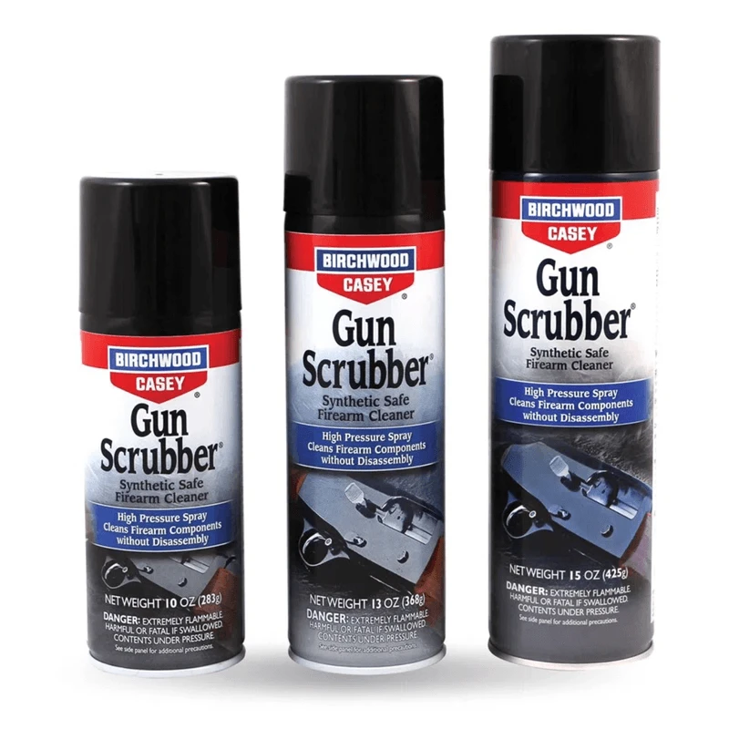 Cleaning your firearm just got a whole lot easier and faster thanks to Birchwood Casey’s gun scrubber firearm cleaner. Gun scrubber firearm cleaner is a pressurized, fast evaporating firearm cleaner that cleans internal metal firearm parts and firearms effectively. While safe for firearm usage, the solvent may harm finished surfaces, plastics, laminates, composites, rubber grips, or other materials used in the construction of today’s firearms. Always test in an inconspicuous area to ensure the product will not harm. Â