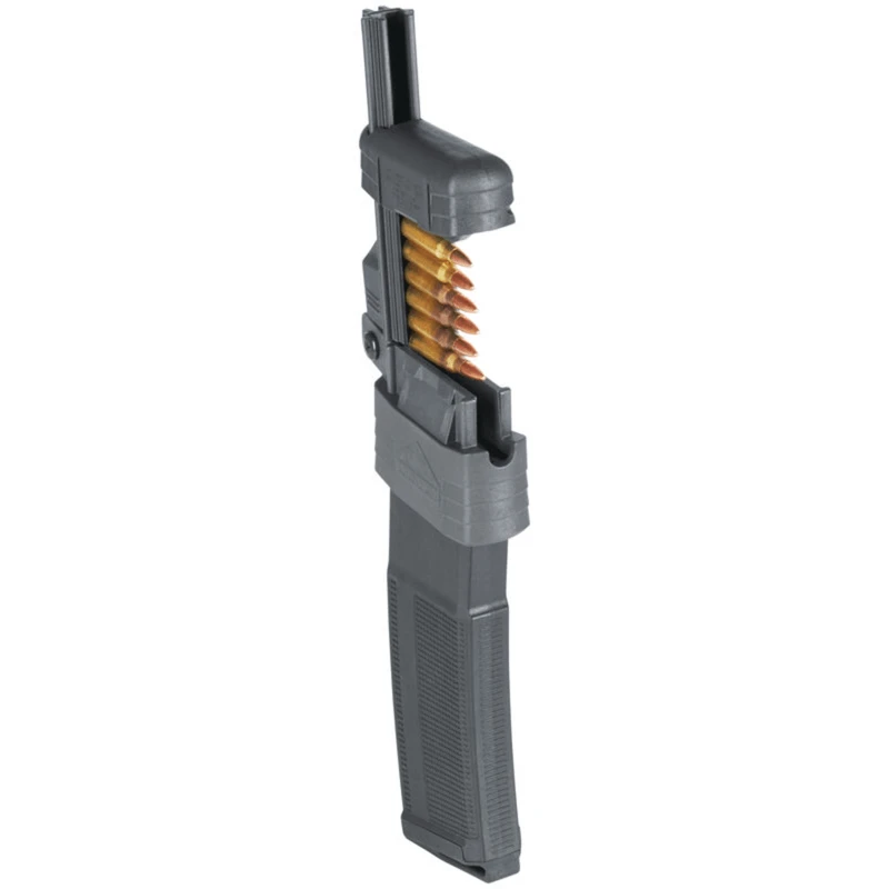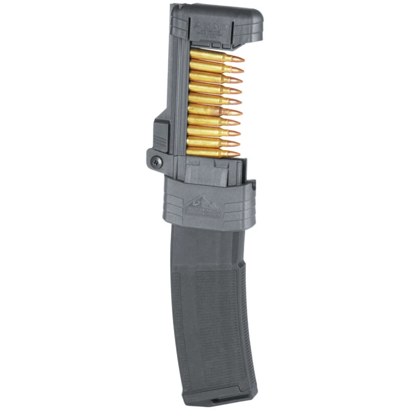 Loose ammo can be loaded one round at a time with a simple click, or engage the loading arm to expedite the process. The loading arm can handle up to 10 rounds of loose ammo, or ammo in a stripper clip, and the rounds are locked into the mag with a quick push. Spend more time shooting, and less time reloading.