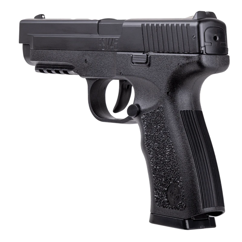 This spring powered pistol combines hand-held comfort with quality components, at an affordable price. The PSM45 also features a 20 shot magazine for BBs, as well as a weaver style rail for mounting lights and accessories.