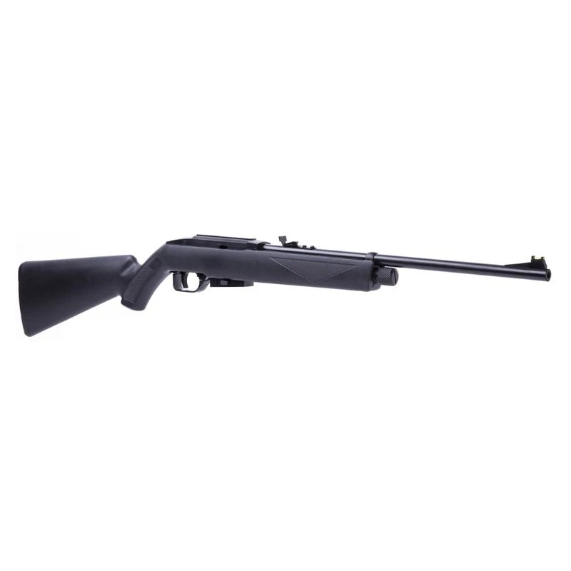 - Traditional hardwood stock and forearm design with rifled steel barrel with 12 round pellet magazine