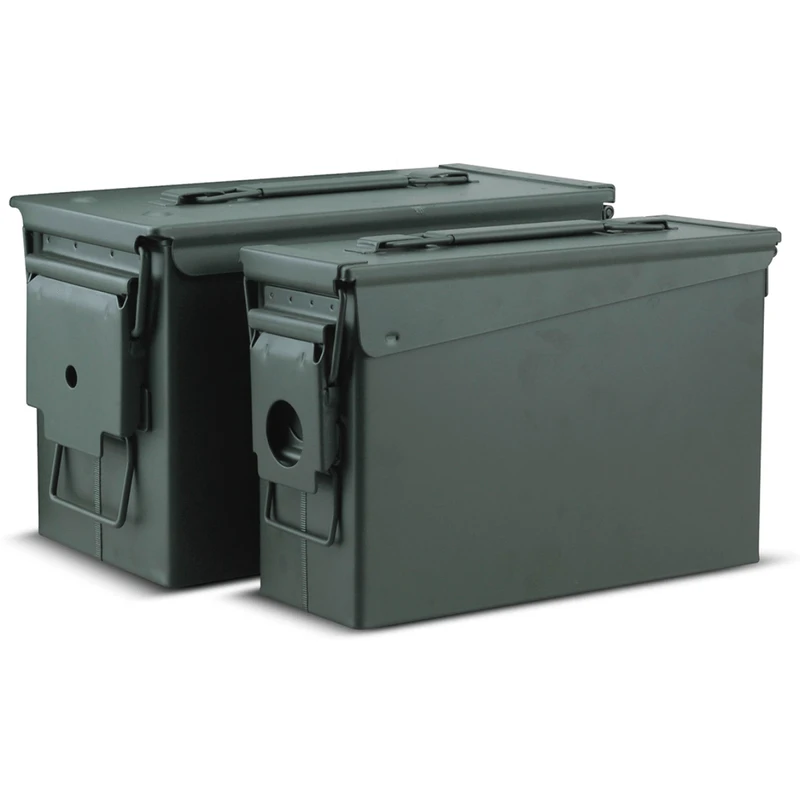 A reliable and versatile ammunition storage solution. This set includes two sturdy metal ammo cans, one in .30 Cal and the other in .50 Cal size, providing ample storage capacity for your ammunition collection. With their rugged construction and weatherproof seals, these ammo cans offer exceptional protection against moisture, dust, and other potential contaminants.