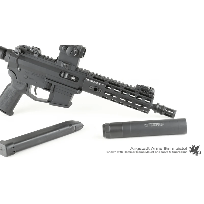 The Griffin Armament taper mount muzzle devices interface with their taper mounted suppressor (RECCE, PALADIN®, Sportsman, Optimus®). To be compatible with the Optimus® 9, THE BLAST BAFFLE MUST BE REMOVED.