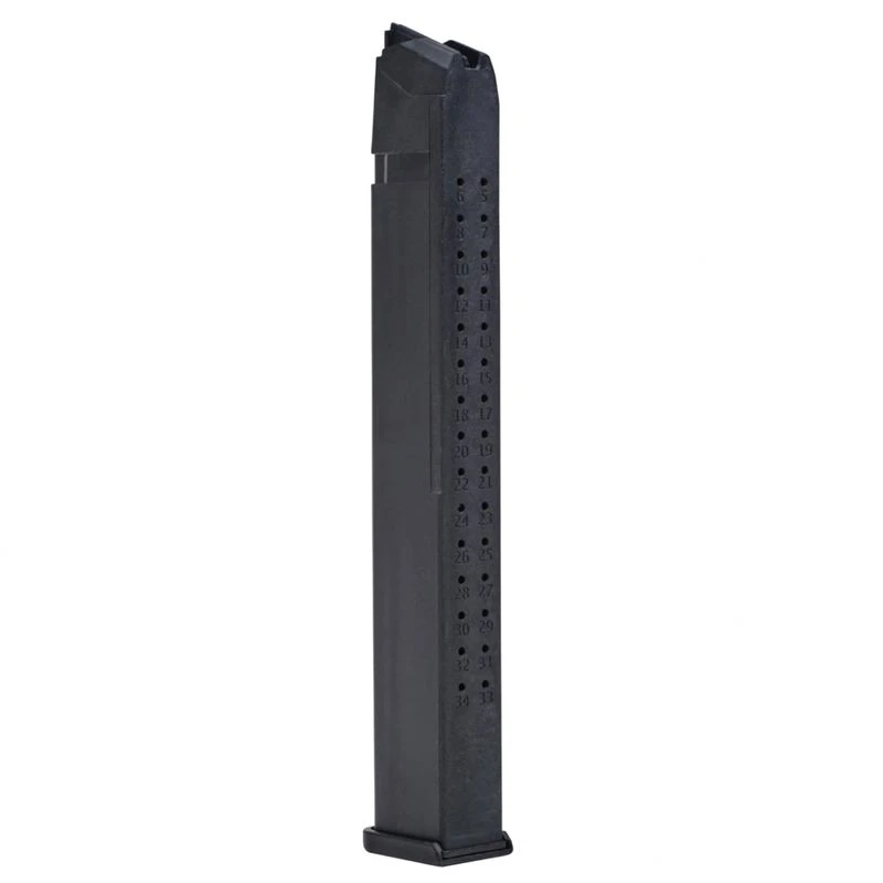 This Is The Glock 9mm 35 Round Magazine From Toolman Tactical. This May Be The Highest-Capacity Stick Magazine For The Doublestack 9mm Glock Pistol! Featuring An Advanced, Featherlight Polymer Construction, This Double-Stack Glock Magazine Holds Up To 35 Rounds Of 9mm Ammunition. Just Like Factory Glock Magazines, This Toolman Tactical Magazine Features Witness Holes For 30 Of The 35 Total Capacity – No More Wondering How Many Rounds Are Truly Left In The Magazine. Its Anti-Tilt Polymer Follower And Steel Spring Promises For Consistent Feeding Into Your Glock 17, 19, Or Other Doublestack Glock 9mm Magazines.