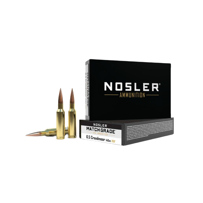 Nosler Match Grade ammunition is loaded with Nosler RDF bullets for ammunition that provides exceptionally high ballistic coefficients. The RDF bullet features a long, drag reducing boat-tail and the smallest, most consistent meplats of any hollow point match bullet line to create ammunition that produces the flattest trajectory and least wind drift possible.