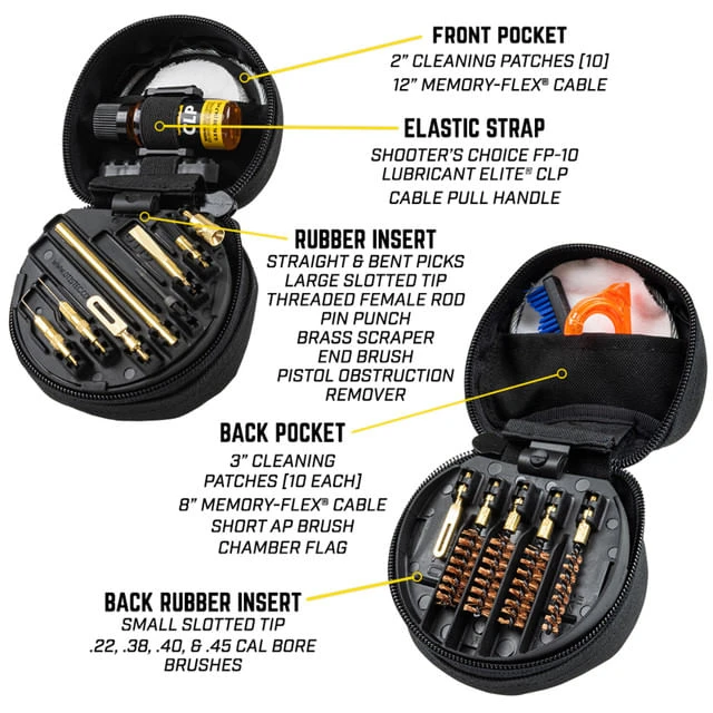 Whether competition shooting or plinking in the backyard, this gun cleaning kit covers proper maintenance for pistols and also includes additional tools for precision cleaning. The unique cotton patches create swabs for 360 degree coverage, ensuring a proper Breech-to-Muzzle clean for .22 cal -.45 cal. pistols. Four bore brushes are included: .22 cal, .38 cal/9mm, .40 cal & .45 cal. This cleaning kit is proudly made in the USA and contained in a lightweight, compact soft pack case.