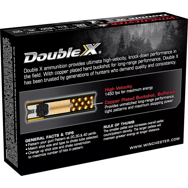 Double X Ammunition provides ultimate high-velocity, knock-down performance in the field. With copper plated hard buckshot for long-range performance, Double X has been trusted by generations of hunters who demand quality and consistency. Buffered copper plated buckshot, provides unmatched long-range performance, tight patterns and maximum stopping power. Â
